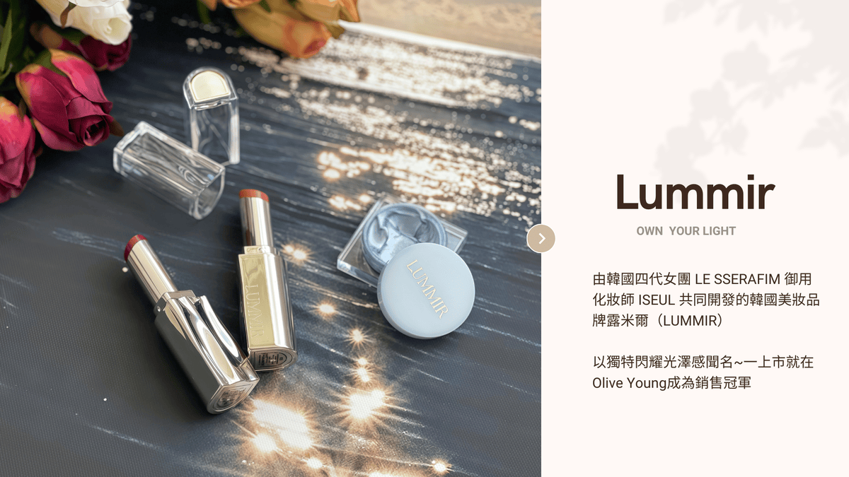 Lummir 這個品牌是由韓國四代女團LE SSERAFIM 御用化妝師ISEUL共同研發~主打✨Own your light✨產品一系列都以獨特閃耀光澤感聞名,一上市就在Olive Young成為銷售冠軍!!🏆