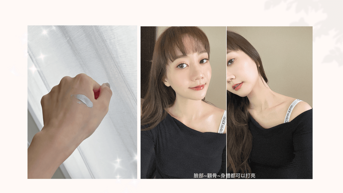 凝膠狀質地 ~ 延展性很好 ! 臉部&身體都可以使用 ! 臉部打亮的部分,我打亮在顴骨、鼻頭、山根;身體打亮我打亮在鎖骨、肩膀等部分 ~ 光澤感屬於非常閃耀的水光感,就是韓系專屬的清透水光感✨