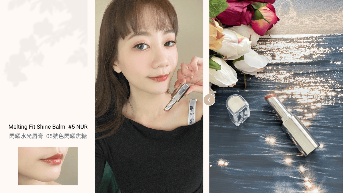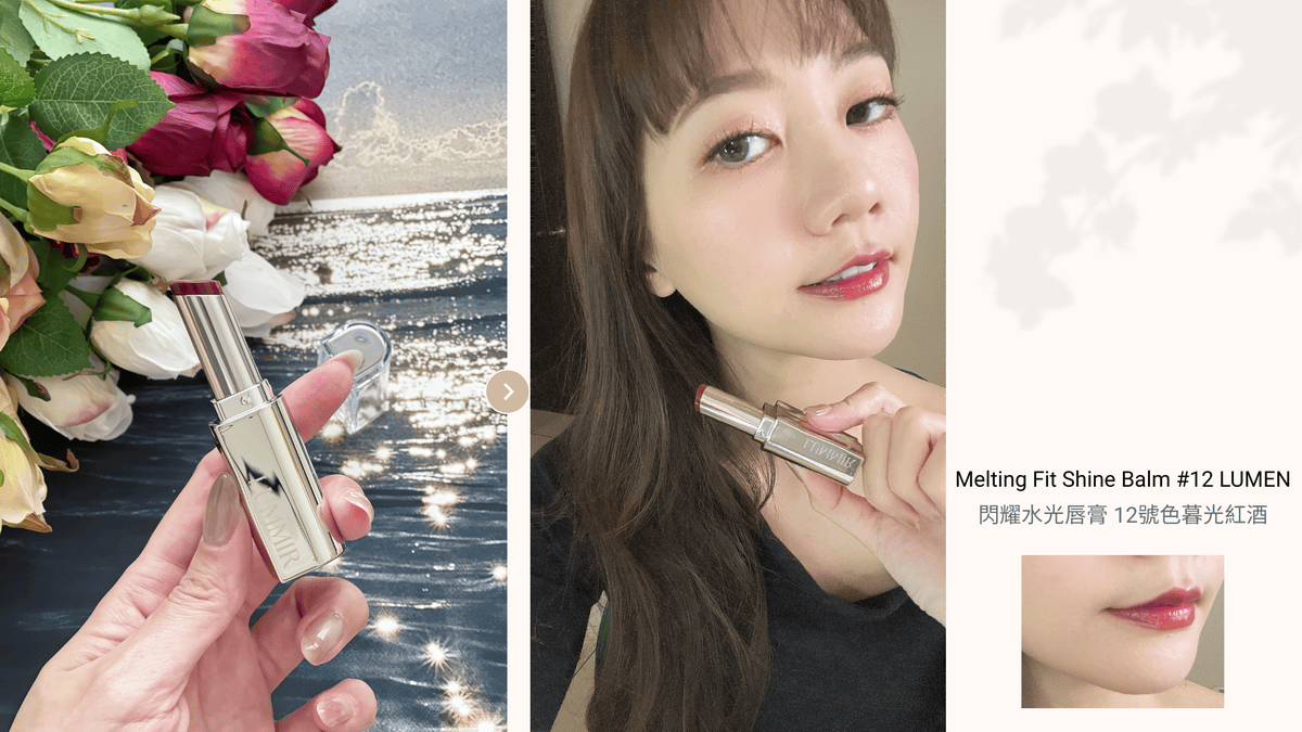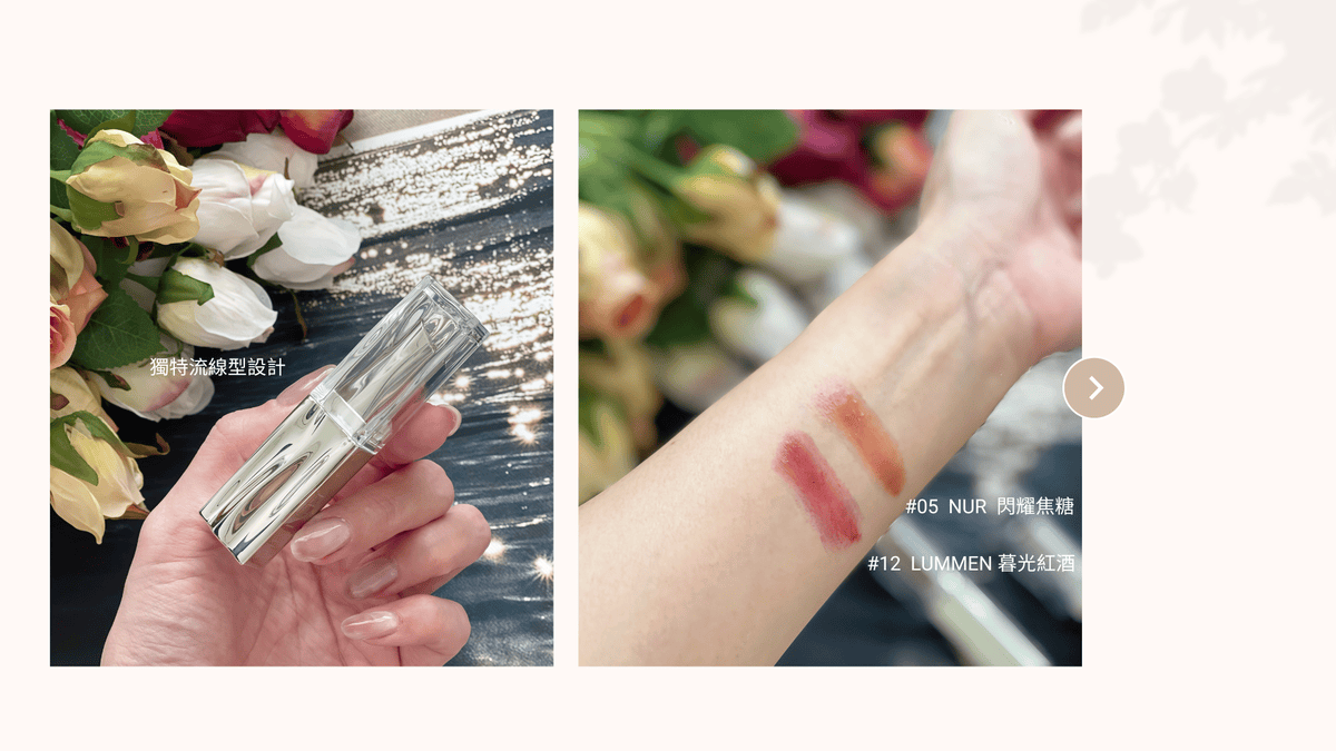 產品設計本身也體現品牌的水光波紋特色,流線型的曲線反映出波光粼粼的感覺~閃耀水光唇膏這次特別選了兩個顏色~05號色 閃耀焦糖還有12號色 暮光紅酒🍷